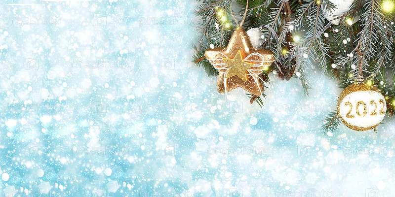 Рождество и Новый год 2024 фон с огнями и украшениями боке, игрушки с еловыми ветками в снежных хлопьях, баннер для праздничного экрана, шаблон для дизайна. Праздничная открытка, избирательный фокус,