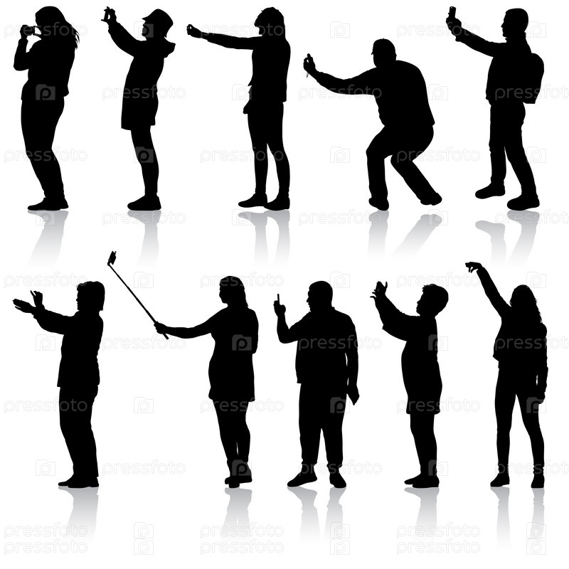 Установите силуэты мужчины и женщины, делающих селфи со смартфоном на белом фоне. Векторная иллюстрация