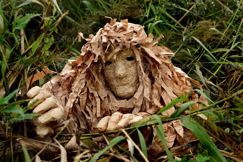 Лесной леший прячется в зеленой траве. Хэллоуин