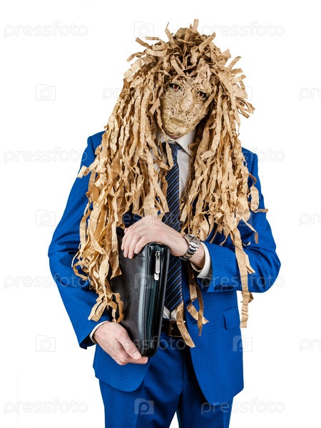 Мужчина в деловом синем костюме стоит с папкой для документов и в маске гоблина