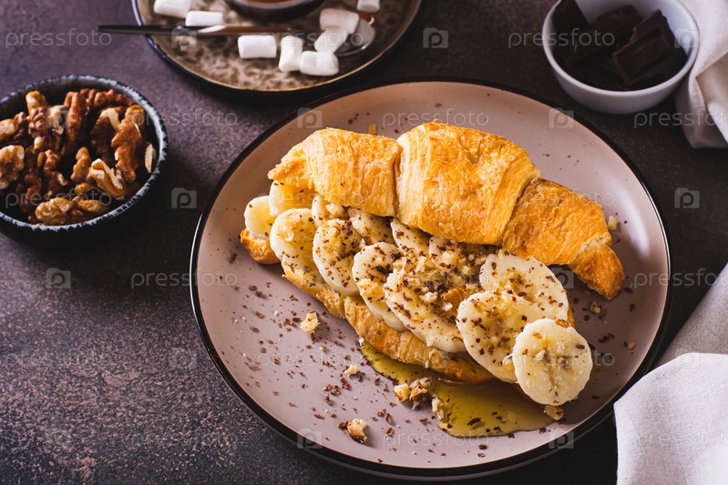 Сэндвич с круассаном с бананом, медом и орехами на тарелке на столе