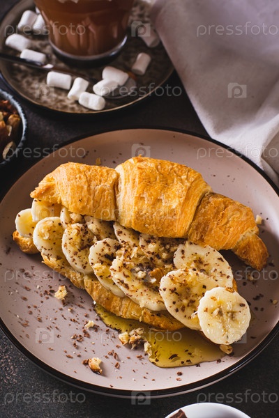 Круассан-сэндвич с бананом, медом и орехами на тарелке на столе, вертикальный вид