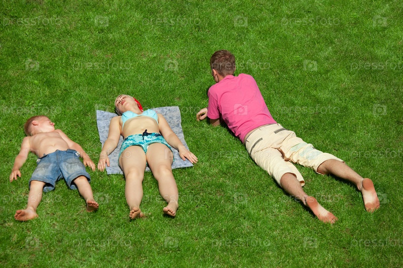 Семья отдыхает, лежа на траве