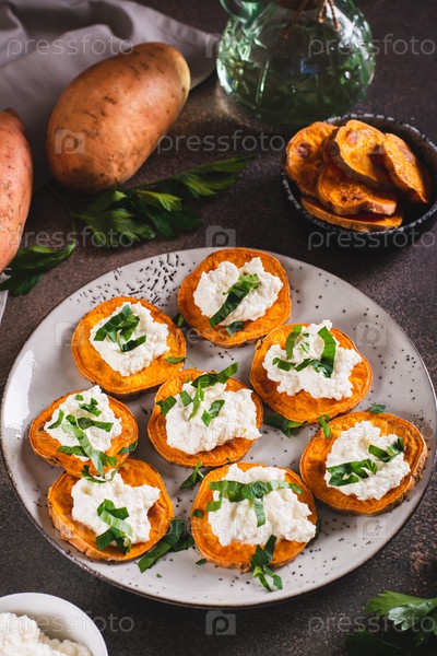 Запеченные кружки сладкого картофеля со сливочным сыром и петрушкой на тарелке на столе, вертикальный вид
