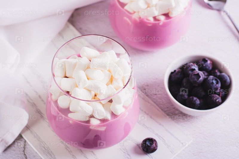 Смузи из молока и черники с зефиром в стакане на столе
