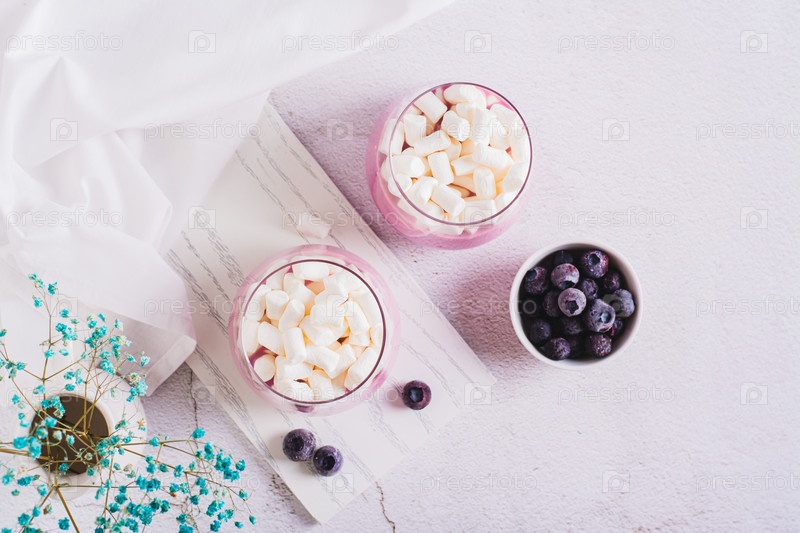 Коктейль с черничным йогуртом и зефиром в стакане на столе, вид