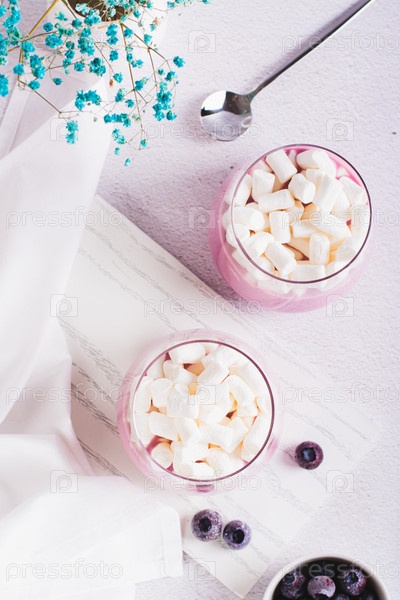 Смузи из молока и черники с зефиром в стеклянной столешнице и вертикальном виде