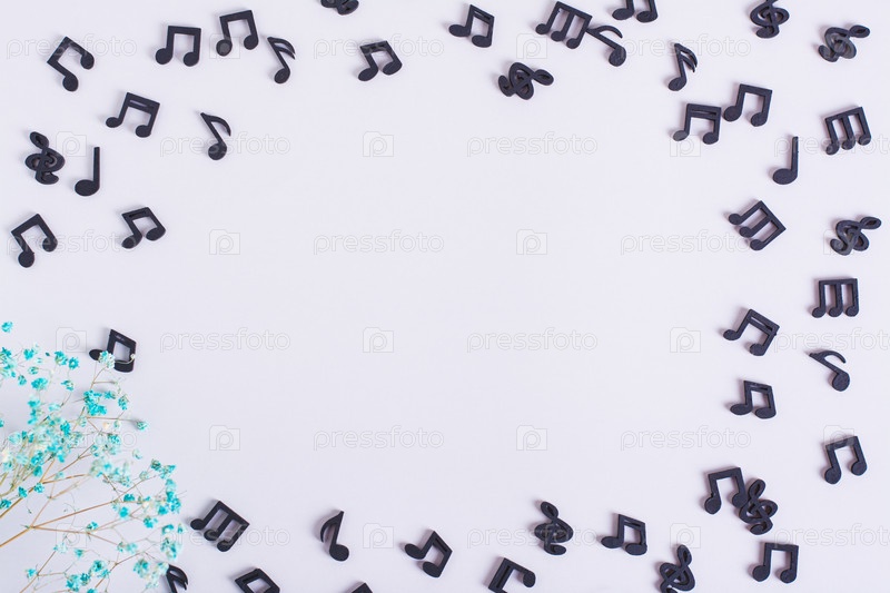 Музыкальная концептуальная рамка из черных нот и сухих цветов на светлом фоне