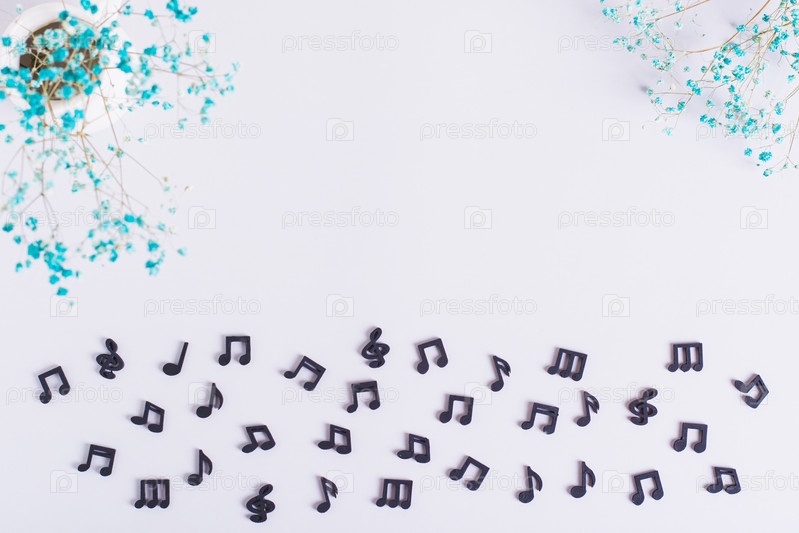 Концептуальный фон из черных музыкальных нот и сухих цветов, вид сверху