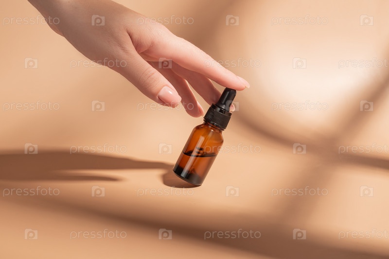 Флакон-капельница с сывороткой красоты в женских руках. Лечение ухода за кожей, распорядок дня для здоровой кожи