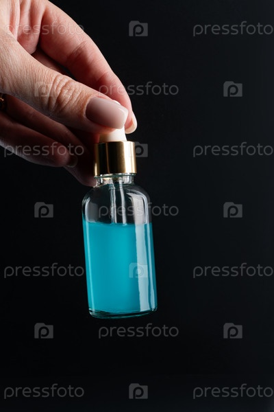 Женская рука держит бутылочку-капельницу с сывороткой для лица с морским коллагеном. Концепция ухода за кожей. Бутылка косметического продукта без торговой марки
