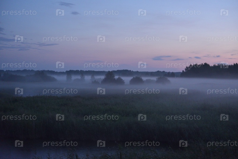 Туманный пейзаж поздно вечером в летнем поле. Лес в дымке после дождя. Ночной лес и поле