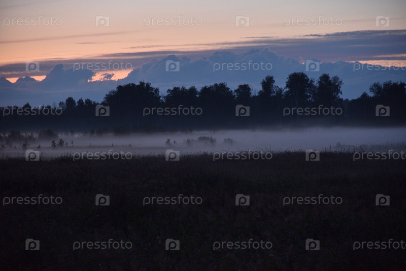 Туманный пейзаж поздно вечером в летнем поле. Лес в дымке после дождя. Ночной лес и поле