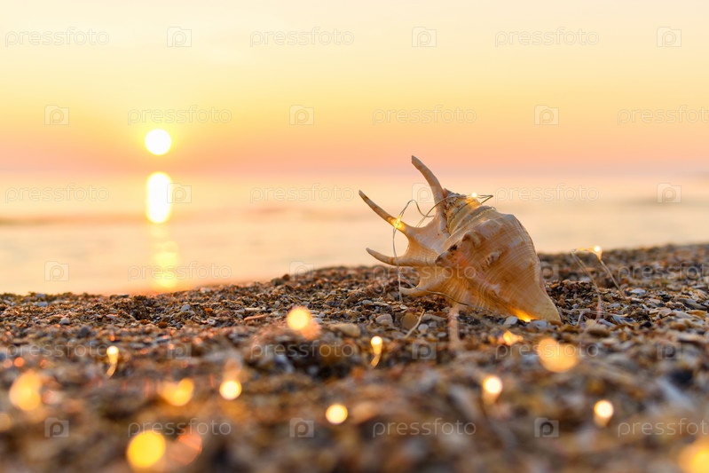 Красивая ракушка с гирляндными огнями на фоне моря и красивого заката. Новогодняя открытка с морским фоном. Селективный фокус на оболочке