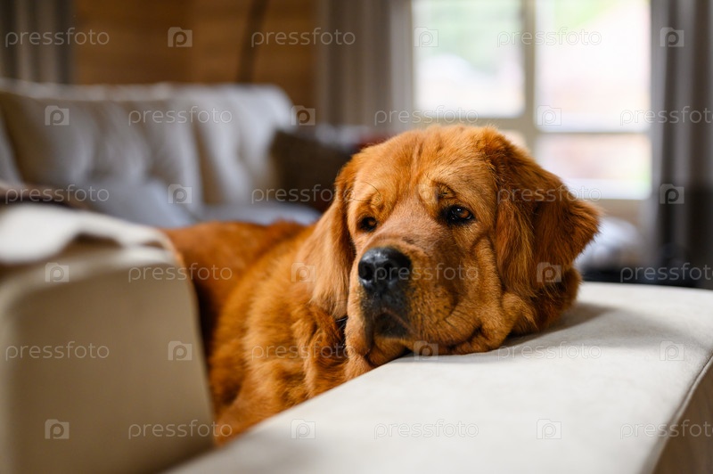 Крупным планом портрет большой собаки. Собака лежит на диване. Селективный фокус на глазах