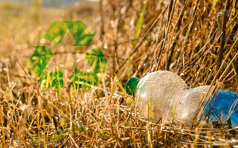 Знак переработки рядом с пластиковым мусором на природе. Концепция отказа от пластика и использования биоразлагаемых материалов