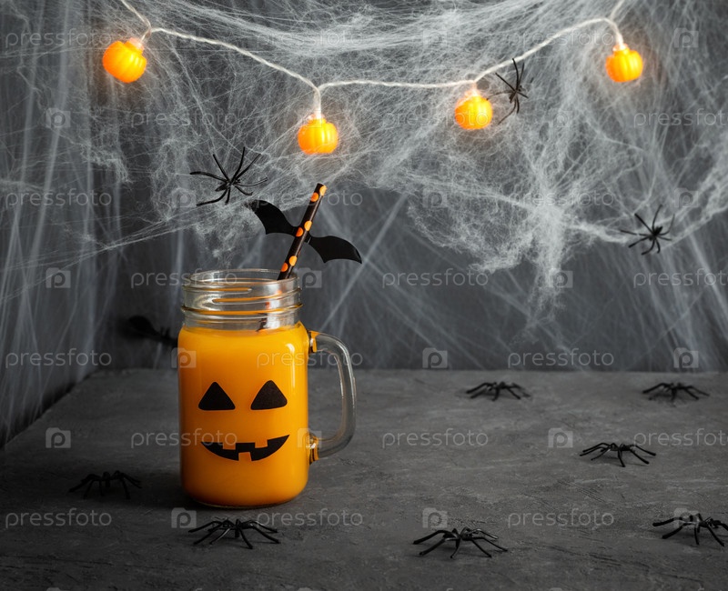 Хэллоуинский тыквенный или морковный напиток в стеклянной банке со страшным лицом, пауками и паутиной. Украшения для вечеринки в честь Хэллоуина с соком, светящиеся гирлянды на сером фоне