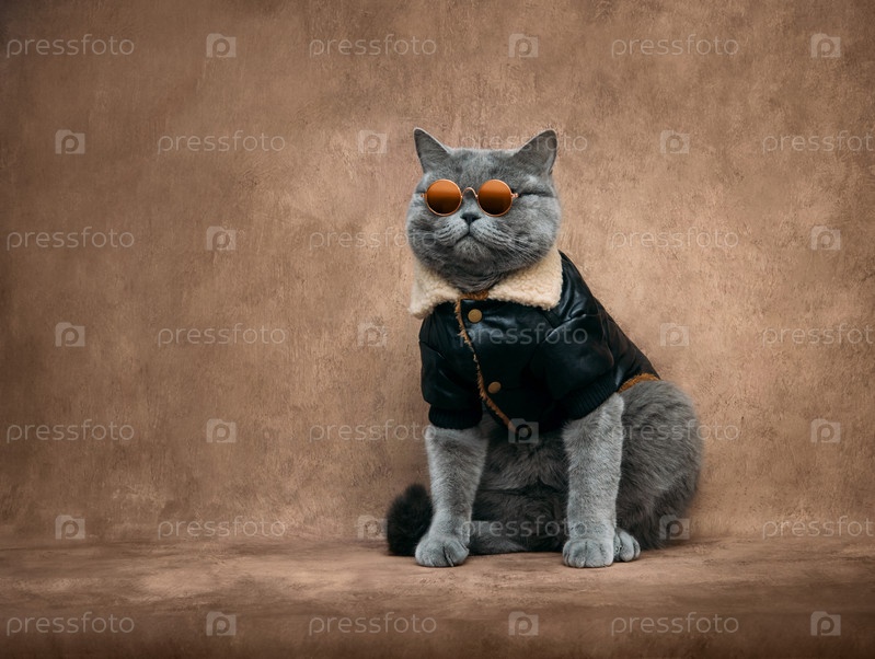 Толстый кот в кожаной куртке и солнечных очках. Британский кот в одежде на бежевом фоне. Жестокий портрет кота. Копирование пространства