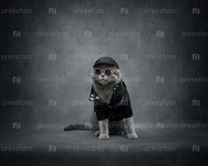 Жестокий британский кот на сером фоне с копировальным пространством. Кот-байкер в черной кожаной куртке, кепке и солнцезащитных очках. Рок стиль. Забавный кот в одежде