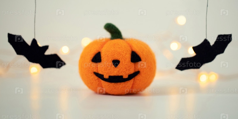 Джек о Фонарь валял игрушку и летучие мыши на белом фоне с боке. Тыква на Хеллоуин, валяная из шерсти, крупным планом. Баннер