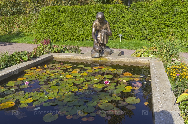 Фонтан в виде девушки, льющей воду из кувшина. Большой розарий в парке Сокольники, Москва, Россия. Солнечный день во второй половине сентября