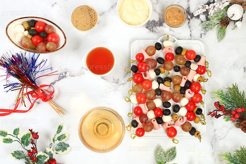 Рождественские и новогодние блюда, набор закусок и освежающих напитков для праздничного стола. Тарелка с канапе из помидоров, сыра моцарелла, оливок, черных оливок и винограда на мраморном столе, выборочный фокус