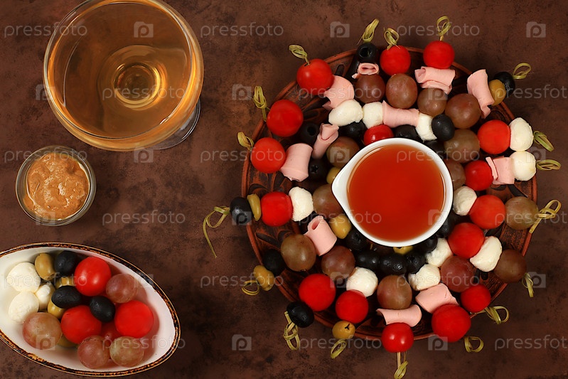 Рождественские и новогодние блюда, набор закусок и освежающих напитков для праздничного стола. Тарелка с канапе из помидоров, сыра моцарелла, оливок, черных оливок и винограда на темном столе, выборочный фокус