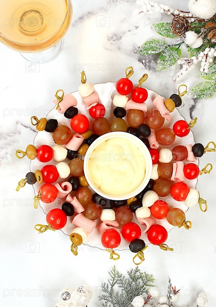 Рождественские и новогодние блюда, набор закусок и освежающих напитков для праздничного стола. Тарелка с канапе из помидоров, сыра моцарелла, оливок, черных оливок и винограда на мраморном столе, выборочный фокус