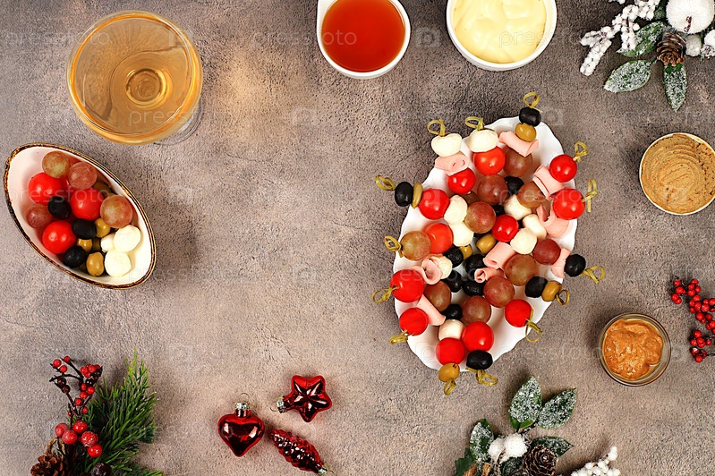 Рождественские и новогодние блюда, набор закусок и освежающих напитков для праздничного стола. Тарелка с канапе из помидоров, сыра моцарелла, оливок, черных оливок и винограда на темном столе, выборочный фокус