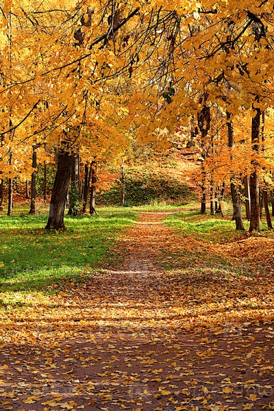 Осенний парк в октябре в солнечный день, тропинка с красными кленовыми листьями и дубами, фон. Красивый яркий природный ландшафт в парке, времена года, золотой осенний сезон, приглашение на прогулку, выборочный фокус