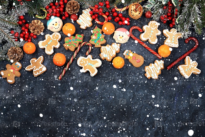 Рождественский новогодний фон, традиционные праздничные пряники и мандарины с еловыми ветками, шишками и украшениями, идея дизайна блюда, концепция выпечки,