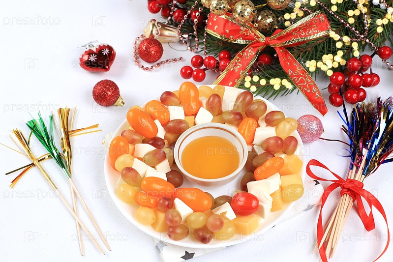 Рождественские и новогодние блюда, набор закусок и освежающих напитков для праздничного стола. Тарелка с канапе из помидоров, сыра моцарелла, оливок, черных оливок и винограда на мраморном столе, выборочный фокус