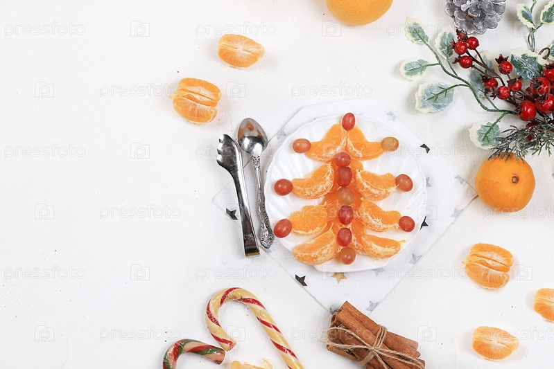 Рождественские новогодние блюда, концепция детокс-диеты, традиционный праздничный мандариновый и виноградный салат, идея дизайна еды, место для рецепта, плоская планировка, избирательный фокус
