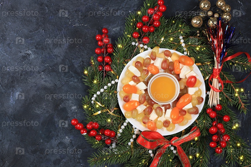 Рождественские новогодние блюда, традиционный праздничный салат с сыром, помидорами, виноградом и медом с еловыми ветками, шишками и украшениями, идея дизайна блюда, выборочный фокус,