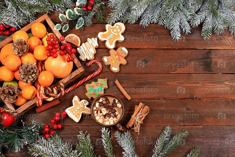 Рождественский новогодний фон, традиционные праздничные пряники и мандарины с еловыми ветками, шишками и украшениями, идея дизайна блюда, концепция выпечки, выборочный фокус,