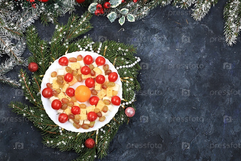 Рождественские новогодние блюда, традиционный праздничный салат оливье и сыр с помидорами, виноградом и медом с еловыми ветками, шишками и украшениями, идея дизайна блюда, выборочный фокус,