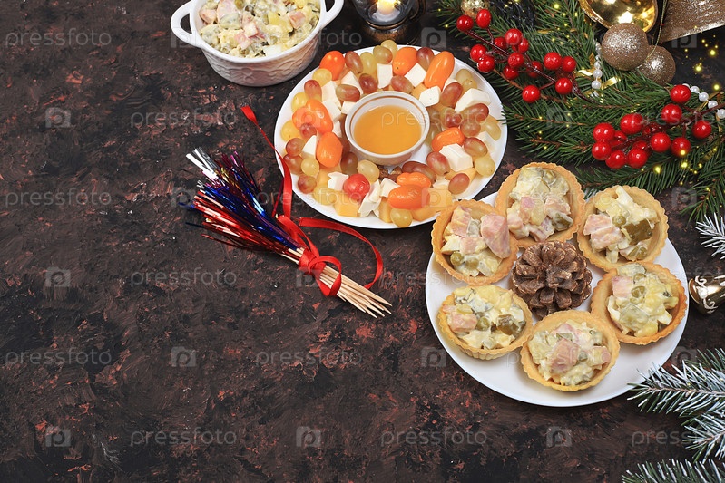 Рождественские новогодние блюда, традиционный праздничный салат оливье и сыр с помидорами, виноградом и медом с еловыми ветками, шишками и украшениями, идея дизайна блюда, выборочный фокус,