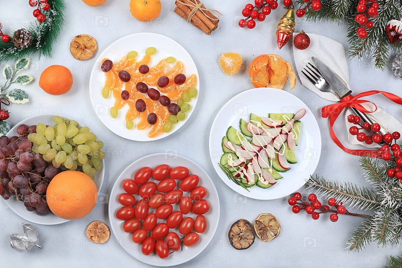 Рождественские новогодние блюда, концепция детокс-диеты, традиционный праздничный салат из огурцов, помидоров и редиса, здоровый образ жизни и концепция здорового питания, избирательный фокус