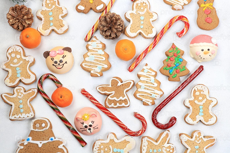 Рождественский новогодний фон, традиционные праздничные пряники и мандарины с еловыми ветками, шишками и украшениями, идея дизайна блюда, концепция выпечки,