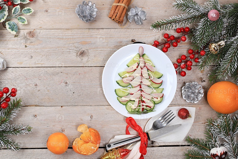 Рождественские новогодние блюда, концепция детокс-диеты, традиционный праздничный салат из огурцов, помидоров и редиса, здоровый образ жизни и концепция здорового питания, избирательный фокус