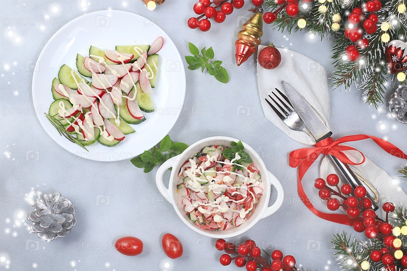 Рождественские новогодние блюда, концепция детокс-диеты, традиционный праздничный салат из огурцов, помидоров и редиса, здоровый образ жизни и концепция здорового питания, избирательный фокус