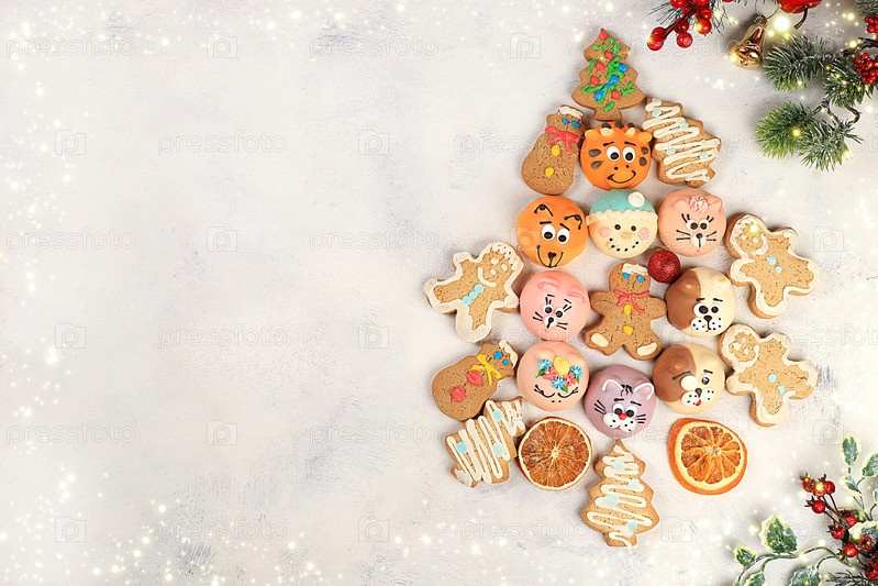 Рождественский новогодний фон, традиционные праздничные пряники и мандарины с еловыми ветками, шишками и украшениями, идея дизайна блюда, концепция выпечки,