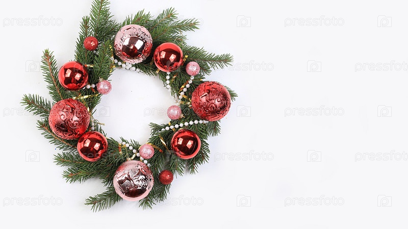 Рождественский венок, рождественский и новогодний фон, праздничные украшения, еловые ветки и красные ягоды рябины, баннер, место для текста. Новогодняя открытка, контент-реклама в Интернете