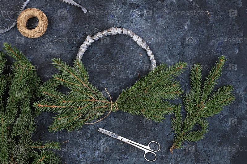 Рождественский венок, рождественский и новогодний фон, праздничные украшения, еловые ветки и красные ягоды рябины, баннер, место для текста. Новогодняя открытка, контент-реклама в Интернете