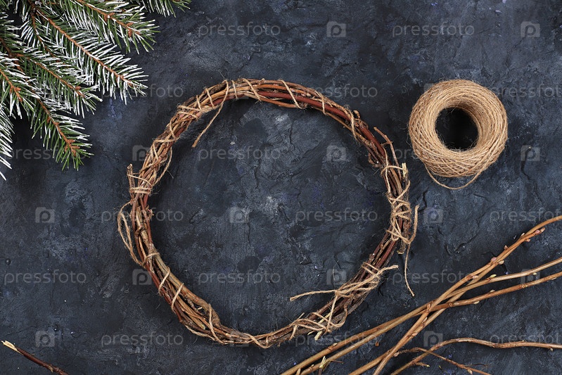 Рождественский венок, рождественский и новогодний фон, праздничные украшения, еловые ветки и красные ягоды рябины, баннер, место для текста. Новогодняя открытка, контент-реклама в Интернете