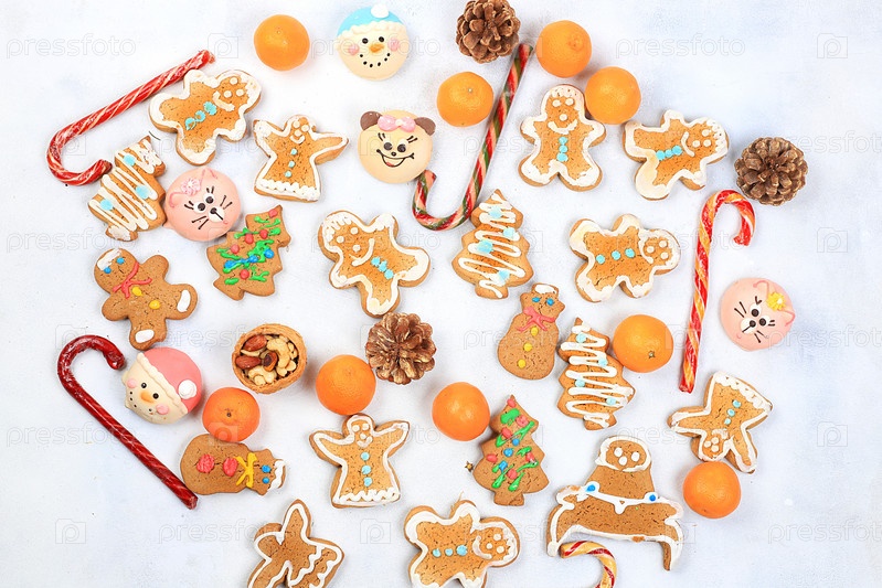 Рождественский новогодний фон, традиционные праздничные пряники и мандарины с еловыми ветками, шишками и украшениями, идея дизайна блюда, концепция выпечки,
