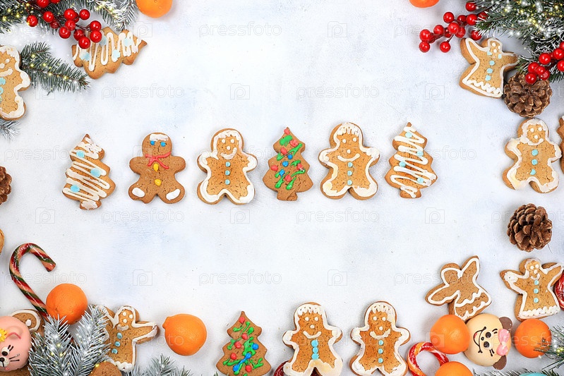 Рождественский новогодний фон, традиционные праздничные пряники и мандарины с еловыми ветками, шишками и украшениями, идея дизайна блюда, концепция выпечки,