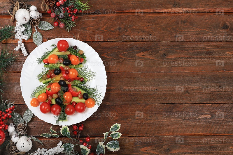 Рождественские новогодние блюда, традиционный праздничный салат с сыром, оливками, помидорами и виноградом, еловыми ветвями и украшениями, идея дизайна еды, выборочный фокус