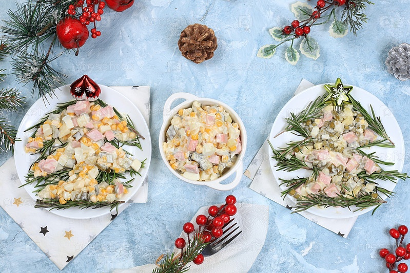 Рождественские новогодние блюда, традиционный праздничный салат с сыром, оливками, помидорами и виноградом, еловыми ветвями и украшениями, идея дизайна еды, избирательный фокус