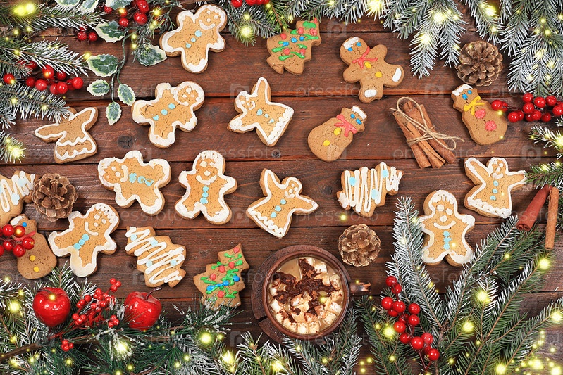 Рождественский новогодний фон, традиционные праздничные пряники и мандарины с еловыми ветками, шишками и украшениями, идея дизайна блюда, концепция выпечки,